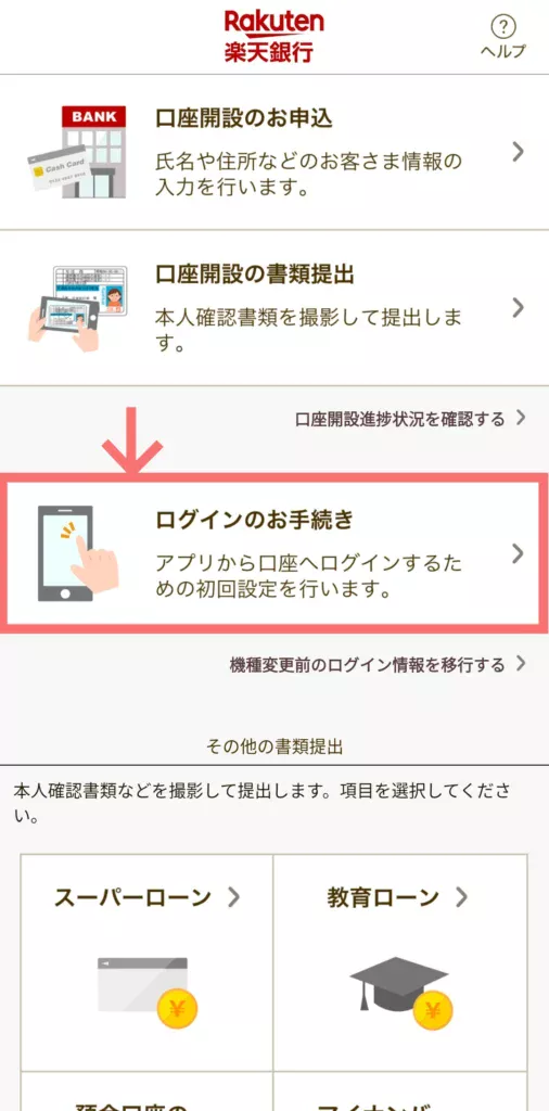 1.楽天銀行アプリを開いて、上から3つ目の【ログインのお手続きをタップ】